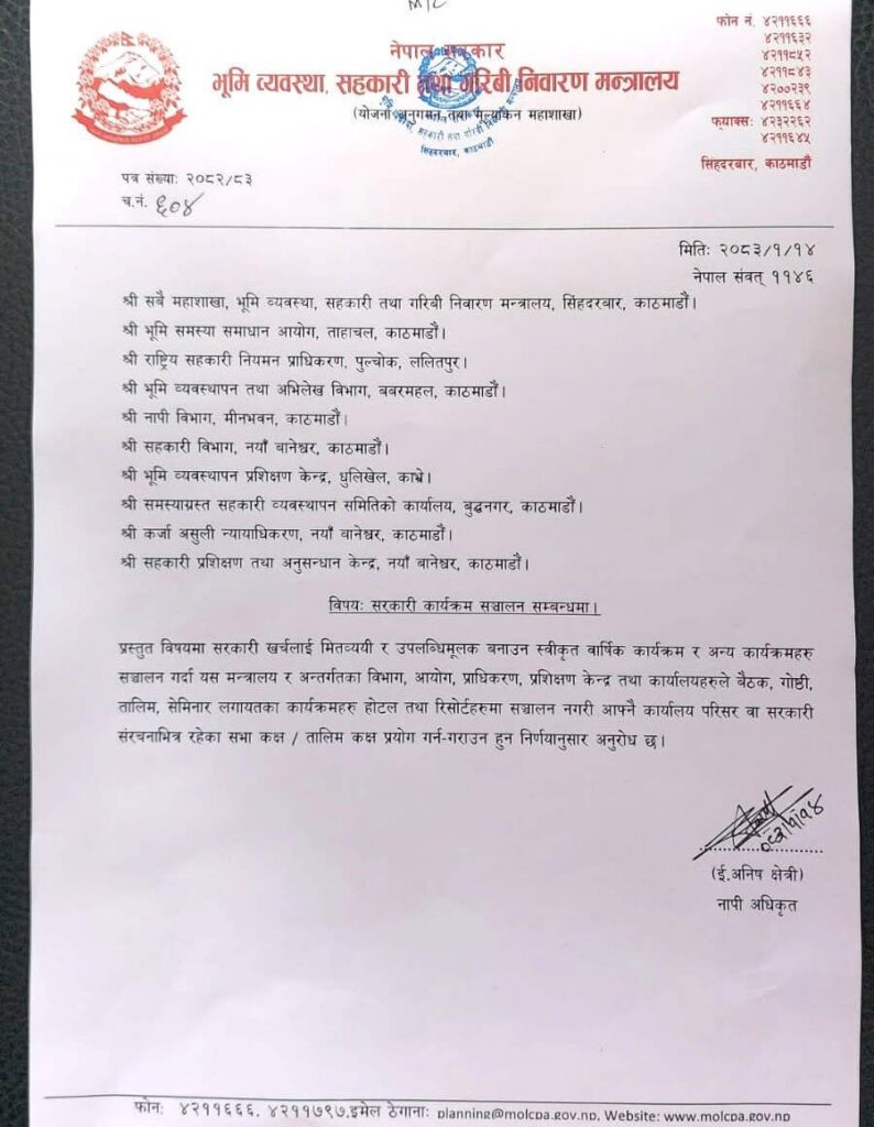 काठमाडौं, १४ बैशाख । भूमि व्यवस्था, सहकारी तथा गरिबी निवारण मन्त्रालयले मातहतका विभाग तथा महाशाखाहरूलाई कार्यक्रम होटल तथा रिसोर्टमा नगर्न स्पष्ट निर्देशन दिएको छ।